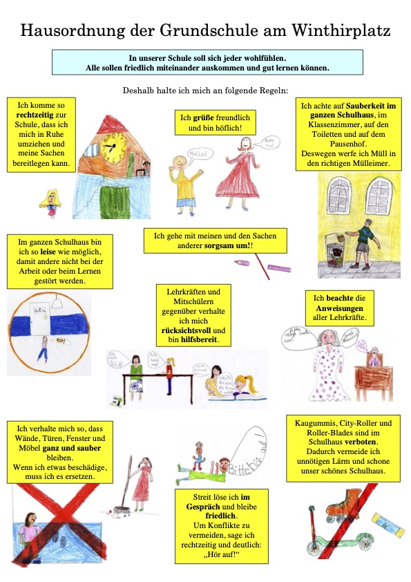 In unserer Schule wollen wir Gemeinschaft aktiv gestalten und dabei die Bedürfnisse jedes einzelnen Mitgliedes ernst nehmen. Deshalb halten wir uns an Vereinbarungen, die das Wohlergehen aller schützen. Wir Lehrkräfte haben uns mit den Schülern zusammengesetzt und folgende Regeln zu unserer Hausordnung zusammengefasst: